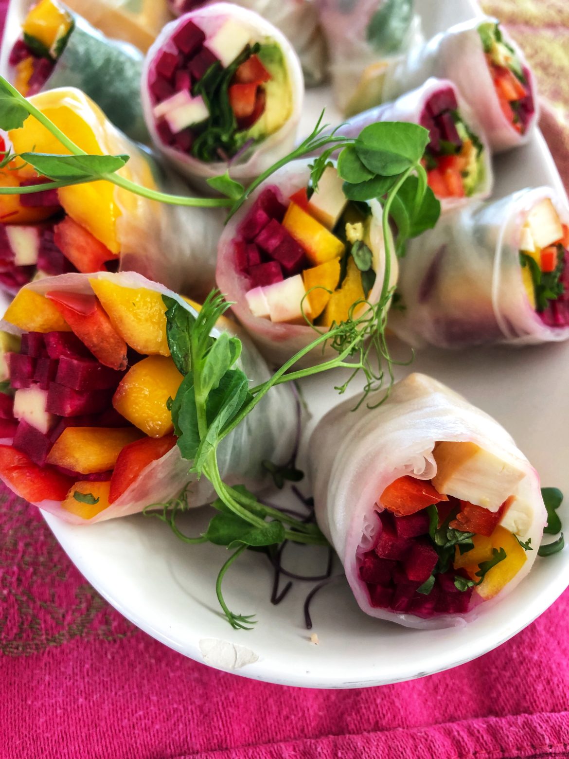 - Summer rolls8-10 rice paper wrappers (smaller size)1 beet, peeled and chopped into matchsticks1 orange or red pepper thinly chopped1 ripe mango cut into small chunks1 avocado sliced finely1 bunch of cilantro1 bunch of mint leavessmoked tofu cut into matchsticks (optional)(other options: carrots, pea sprouts, microgreens, cucumbers)Ginger peanut sauce1/2 cup natural peanut butter (I used chunky)1 1/2 Tbsp soy sauce2 Tbsp maple syrup (or brown sugar)1/2 lime, juice1/2 tsp chili garlic sauce1/2 tsp fresh grated gingerhot water to thin