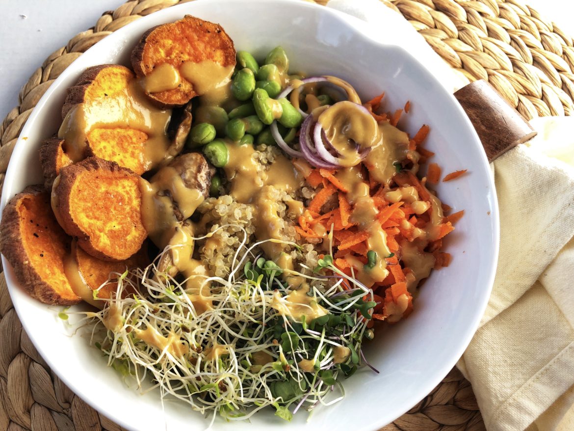 - 2 sweet potatoes, sliced into 1/2 inch rounds1 T olive or coconut oil (melted)sea salt and black pepper to taste2 cups of uncooked quinoaTo assemble bowl:2 cups frozen shelled edamame beans (thawed)2 medium carrots grated4 green or 1/2 red onion sliced thinly1/2 cup chopped cilantro2 teaspoons sesame seeds2 tablespoons hemp seeds1 cup sproutsOrange- Maple Miso dressing: 3 tablespoons miso (comes in tubs in the fridge of your local health food store)1 clove garlic (I added this in to zing it up)2 tablespoons rice vinegar1 tablespoon sesame oil1 tablespoon tahini (sesame paste)- if you don't have this, use sesame seeds1/4 cup fresh orange juice (easy to squeeze an orange for this)1 tablespoon water1 teaspoon maple syrupBlend the dressing ingredients in a food processor or blender until smooth.
