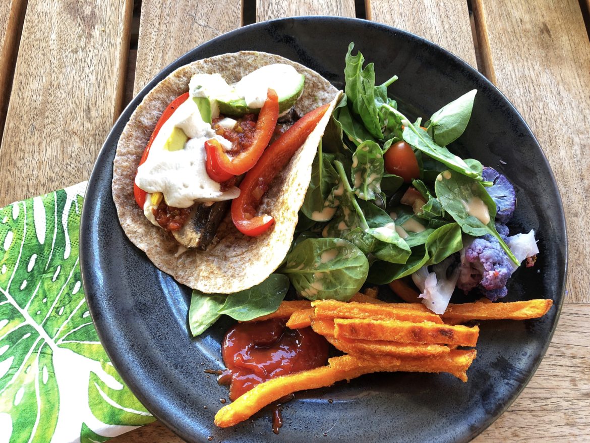 I think the key to this dish is the sauces. You need to marinate the mushrooms for at least half an hour and there is the option to make a delicious garlic cashew sauce if you like. If you haven’t got the time just leave it out or substitute a plant-based sour cream if you can find it where you live.