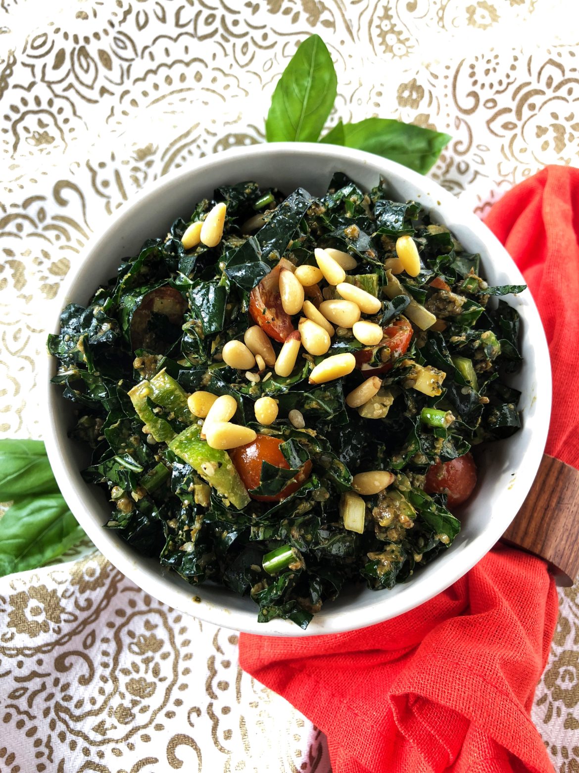 - Salad:4 cups of shredded dinosaur kale2 cups finely diced cabbage - green or purple (optional)1 1/2 tablespoons extra virgin olive oil3/4 cup pesto (either cheese free store-bought, or using the recipe below)3/4 cup grape or cherry tomatoes, halved1/2 cup diced pepper (any colour)1/4 cup diced onion, red or yellow2 tablespoons nutritional yeast1 tablespoon hemp seeds1/4 cup of pine nuts or cashews for toppingPesto Sauce:2 cups basil, loosely packed1/2 cup raw sunflower seeds2 garlic cloves3 tablespoons of nutritional yeast1/4 cup olive oil, more to make it less thick1/4 teaspoon salt
