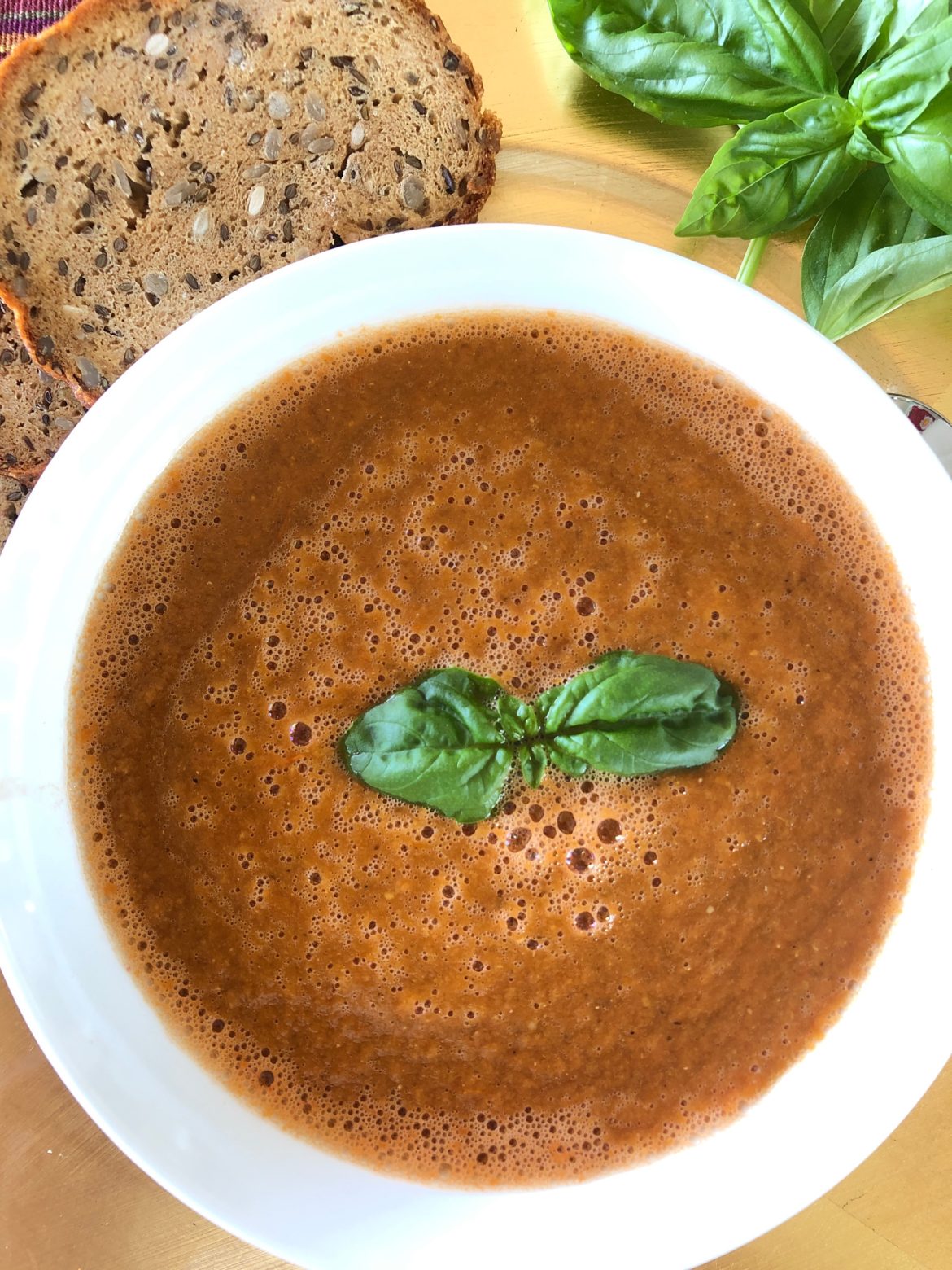 Every year around this time I make either tomato soup or tomato sauce. This year I went for soup. I’m more aware of using less oil now, so I made this recipe completely oil free. The option is there to add oil while roasting the tomatoes but it is plenty flavourful without it.